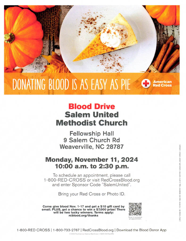 We invite you to come by and join us for the blood drive at Salem United Methodist Church, Fellowship Hall, 9 Salem Church Road, Weaverville, NC 28787, on Monday, November 11, 2024, from 10:00 a.m. to 2:30 p.m.